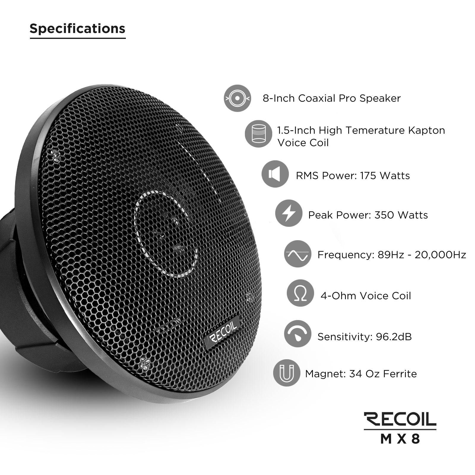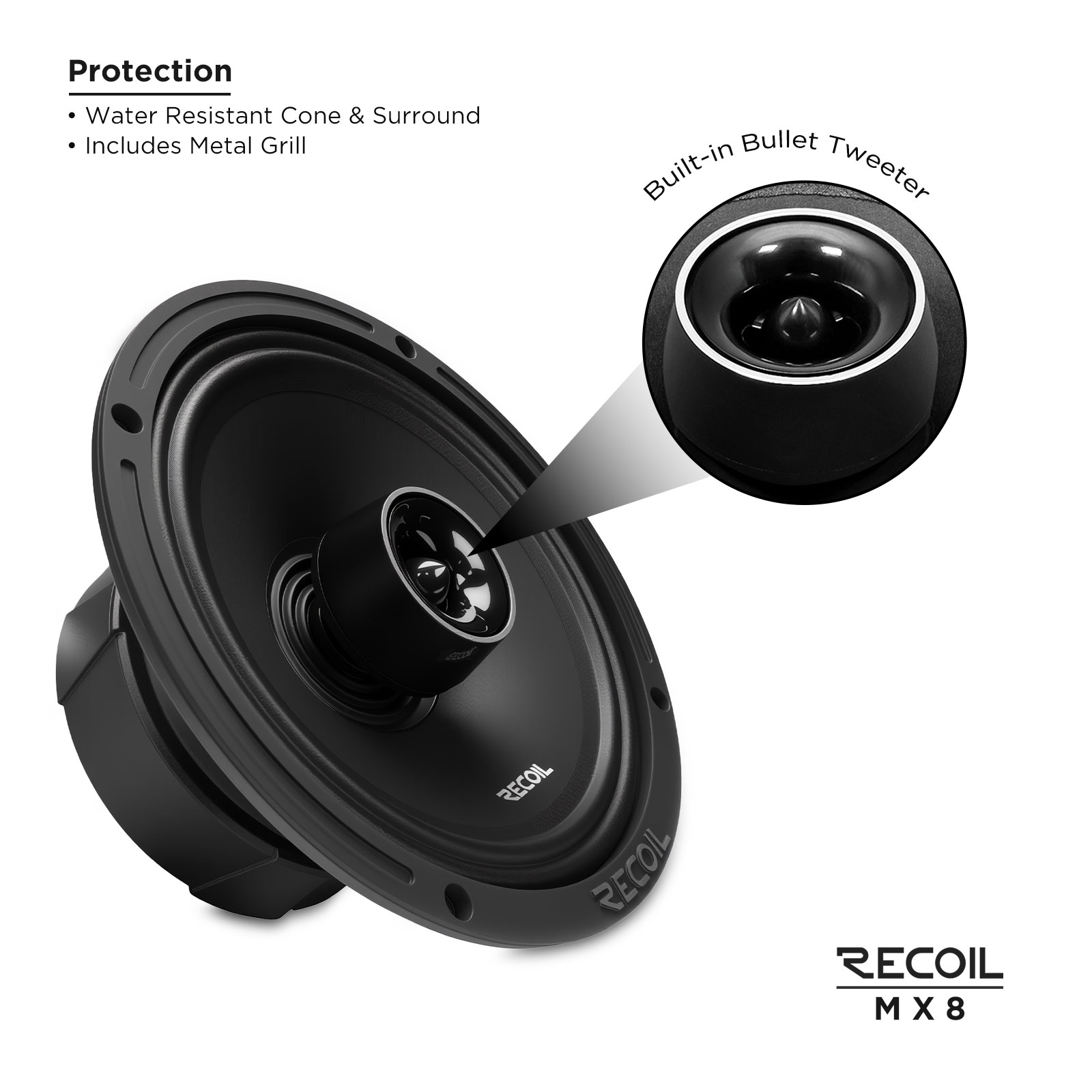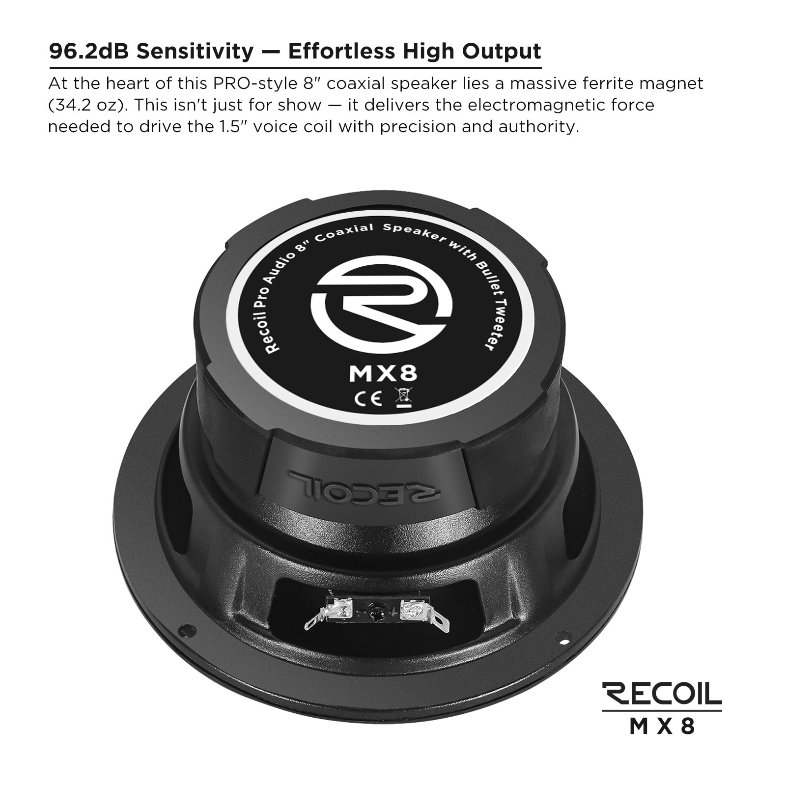 MX8 Pair 8″ Pro Coaxial Car Speaker with Bullet Tweeter – 700W Max, 350W RMS, 96.2dB Sensitivity, 4Ohm, High Output Loud Stereo Sound for Cars, Trucks, Boats