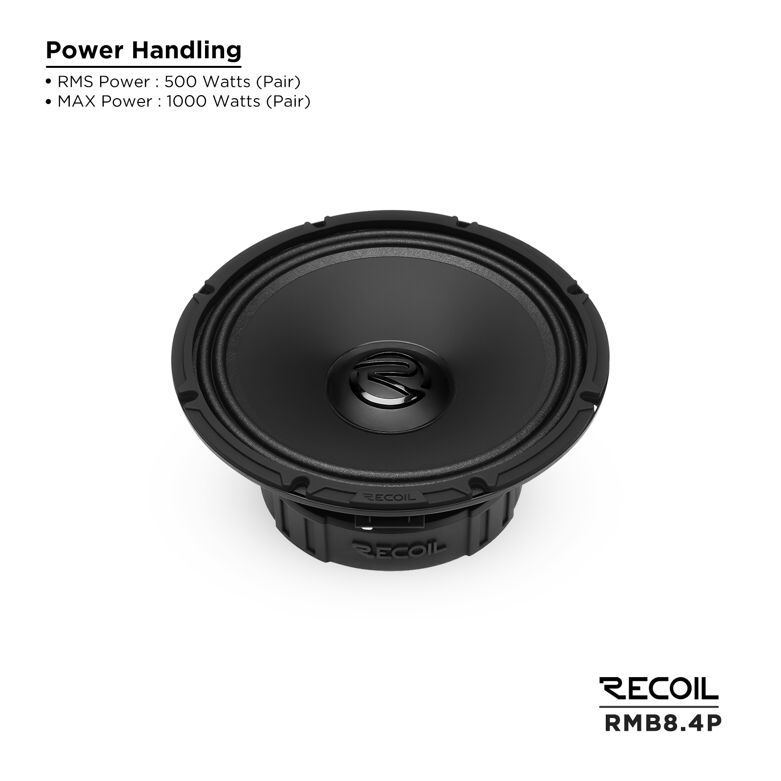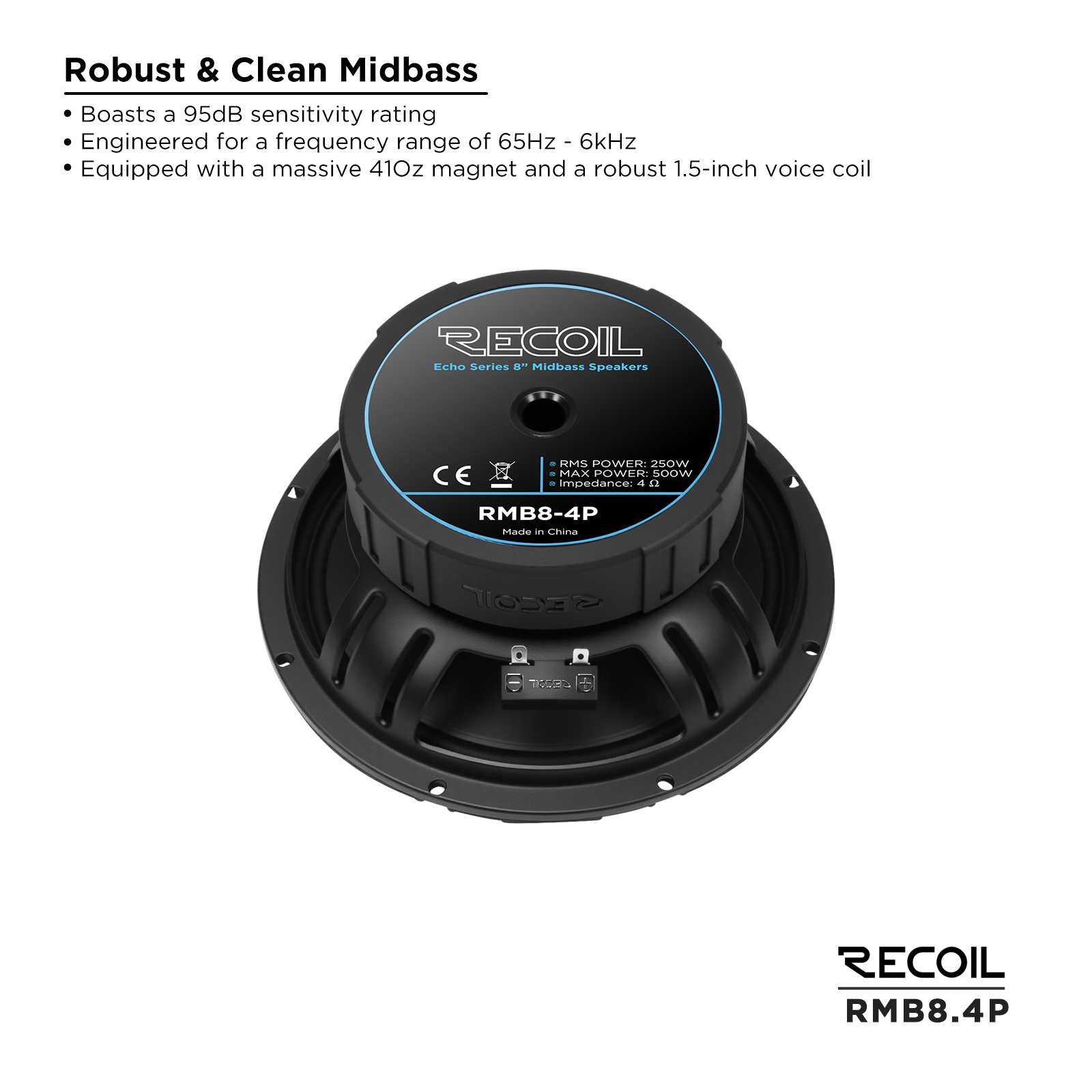 RMB8-4P 8-Inch Midbass Speaker | 250W RMS 500W Max Power | 4 Ohm Car Audio PRO Speakers | 95dB Sensitivity | Pro Midbass Driver for Car Door & Rear Deck Installation